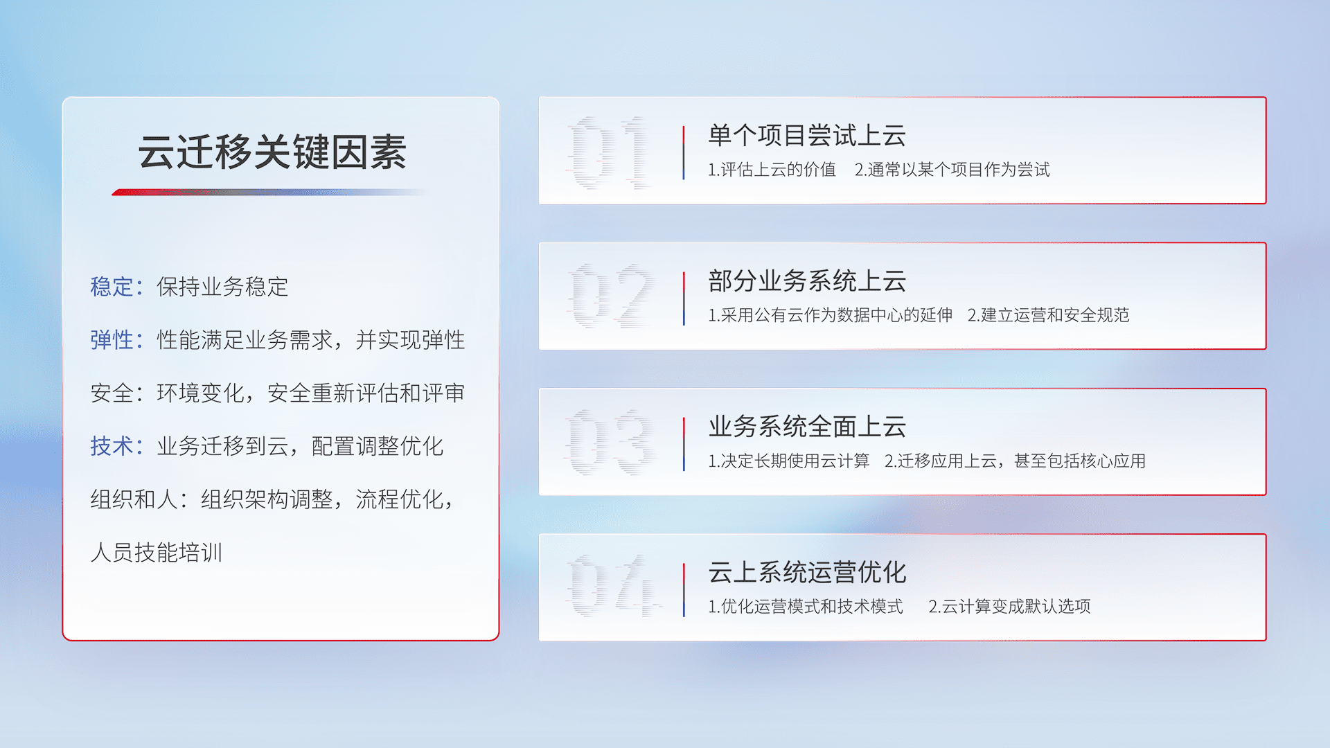 结合实际业务,,从规划设计、、、云平台选型、、云原生改造、、数据迁移、、、集成交付,,,迁移全过程为客户识别最佳上云路径,,做好风险识别管理,,,,设计网络架构、、、身份权限、、安全审计合规、、、、操作审计、、、、日志审计、、、监控告警策略、、、、多站点容灾设计等,,对云上基础设施进行整体规划,,,,提升IT治理水平,,,以满足弹性、、、、高可用、、高性能的需求。。。。